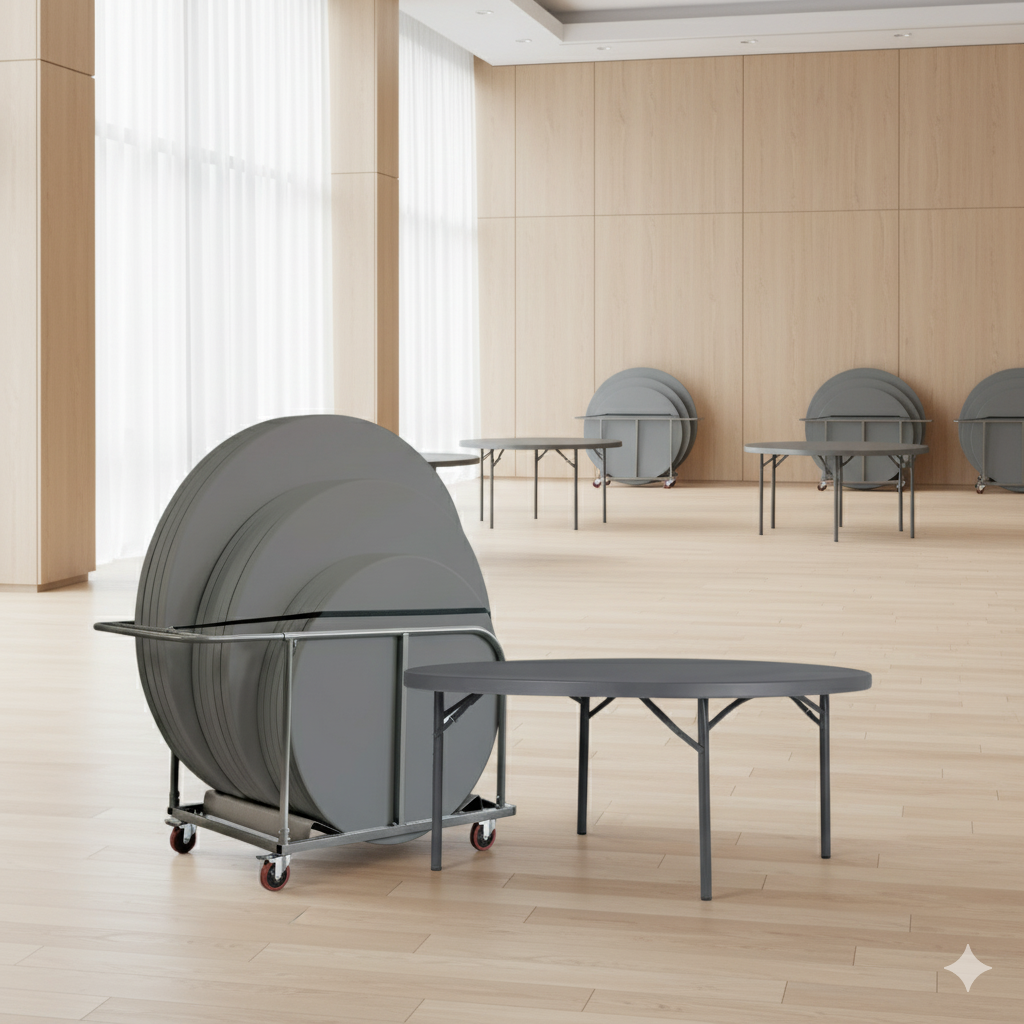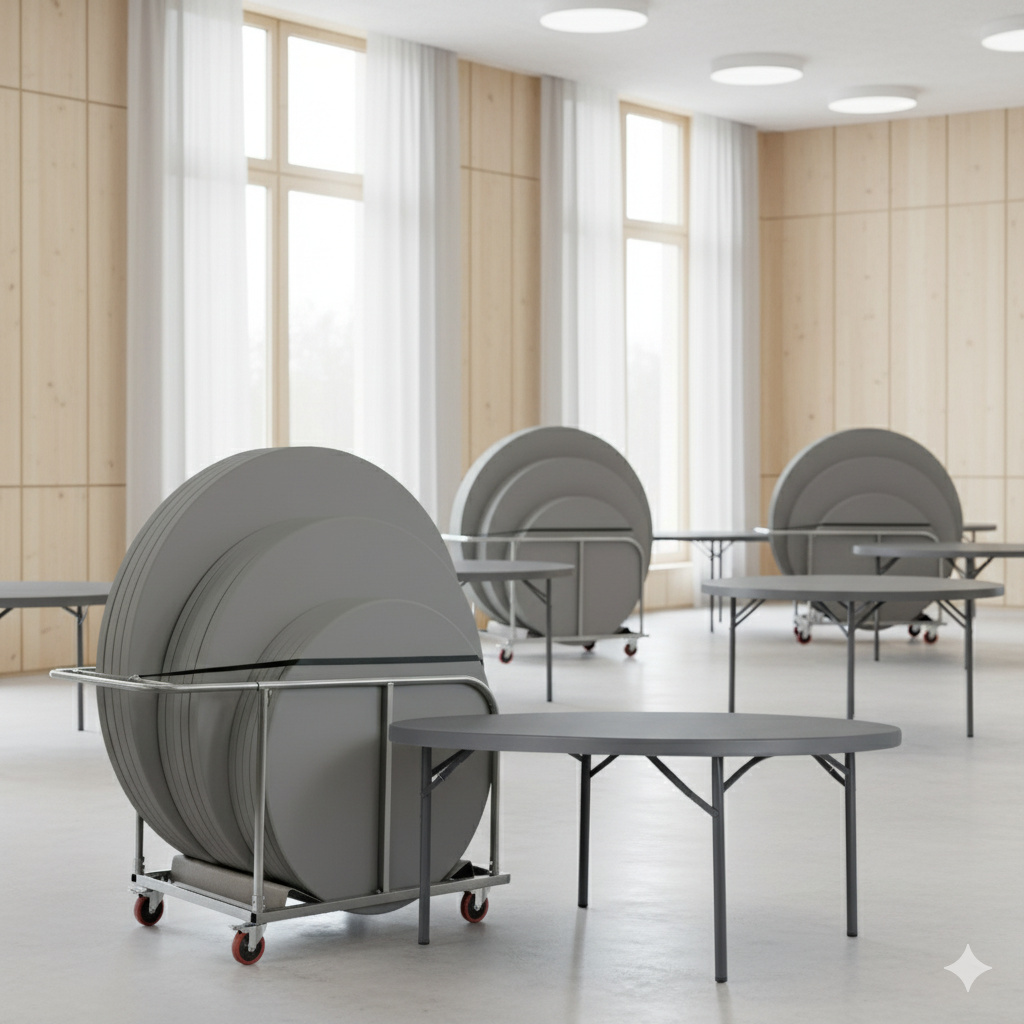 Klapbart design: Bordene er lette å folde sammen og stables vertikalt på bordvognen for effektiv lagring og transport.