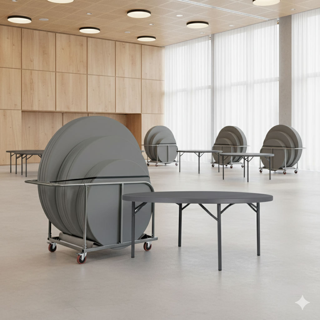 Få maksimal kapasitet og effektiv håndtering med denne komplette løsning, der inneholder 12 store Zown Planet klapborde med en diameter på 180 cm samt en bordvogn specialdesignet til runde borde. Ideell for banketter, konferanser, hoteller og festlokaler, hvor både estetikk, robusthet og logistikk er i fokus.