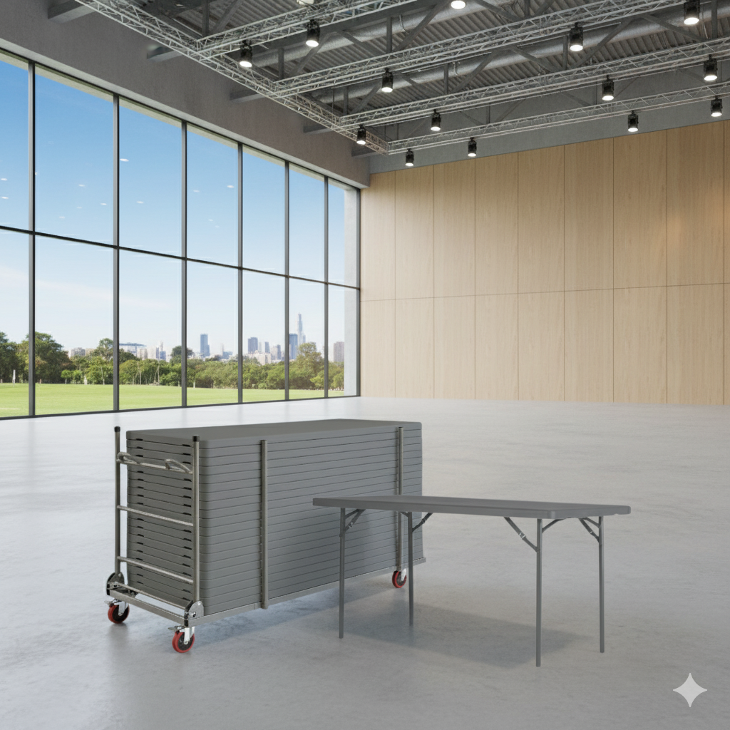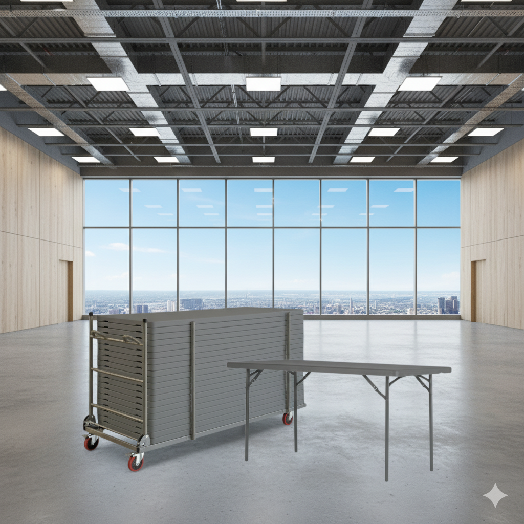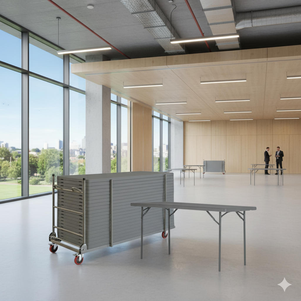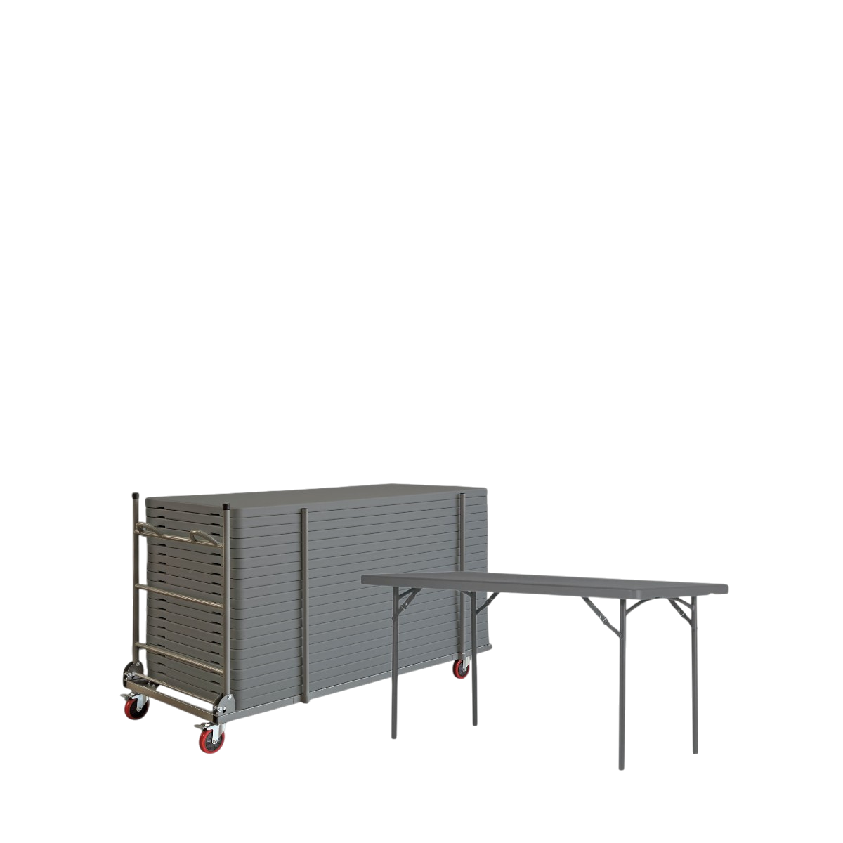 Gratis bordvogn inkluderet: Den robuste bordvogn med hjul gør det let og hurtigt at transportere og opbevare op til 20 borde.