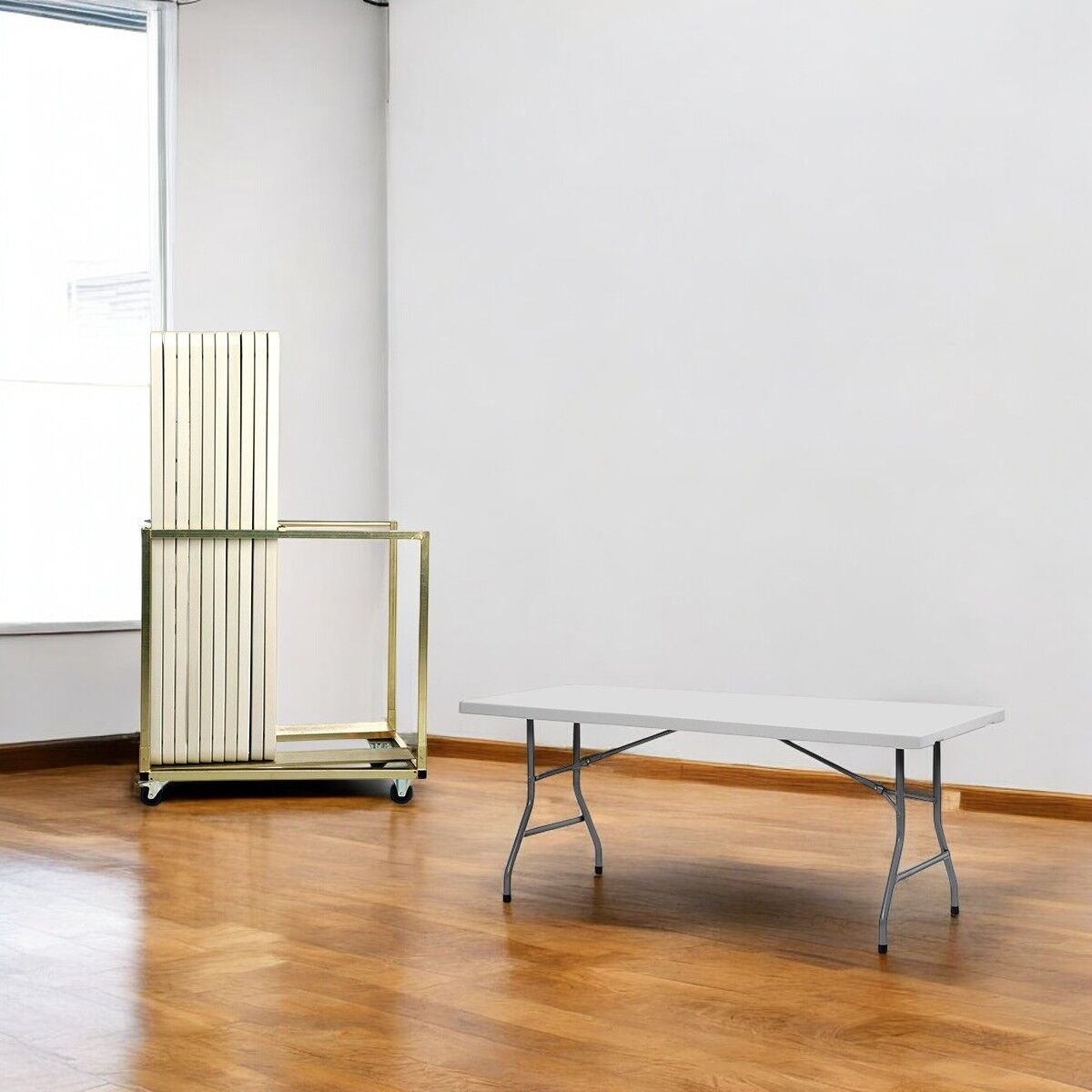 Effektiv bordvogn medfølger: Den medfølgende bordvognen har kapasitet til alle 21 bordene og gjør det enkelt å flytte og oppbevare dem – perfekt for raske opp- og nedmonteringer.