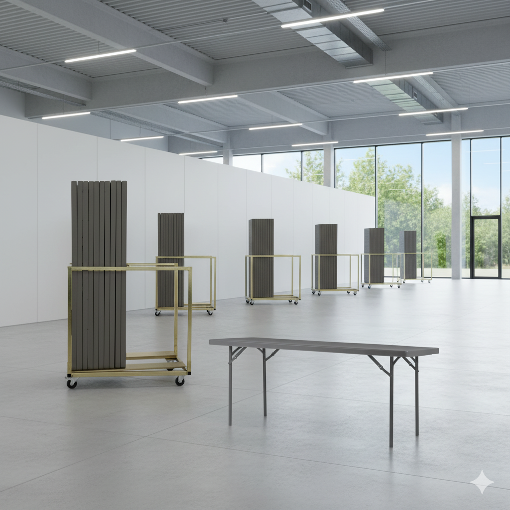 Denne pakke er ideel til hoteller, konferencecentre, forsamlingshuse eller eventvirksomheder, hvor fleksibilitet, funktionalitet og hurtig håndtering er afgørende. Med 21 borde og medfølgende vogn er du altid klar til at skabe den rette atmosfære – uanset arrangementets størrelse.