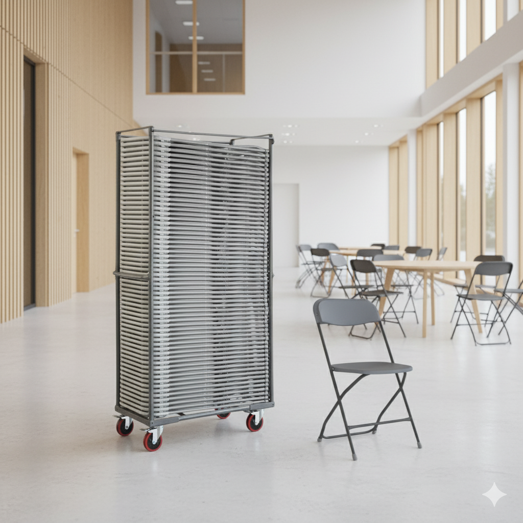 Gør din næste opsætning enkel, hurtig og professionel – bestil denne komplette stolepakke med gratis vogn i dag.