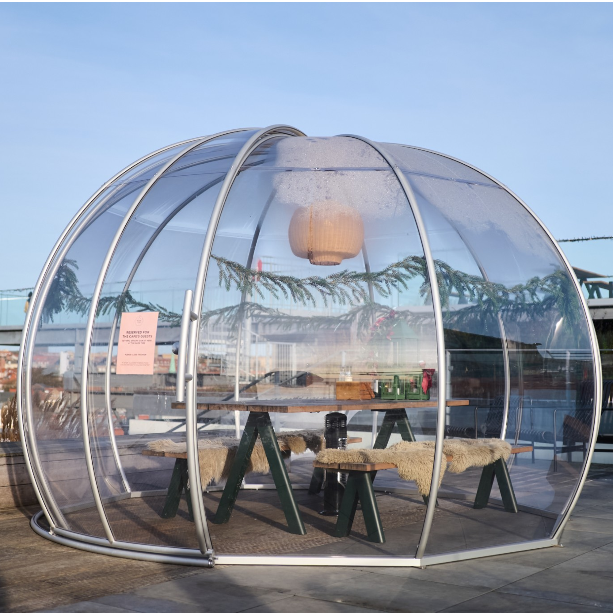 Med Astreea® Igloo MAX XXL kan du utnytte ditt utendørsareal fullt ut – sommer som vinter. Det gjennomsiktige designet gir en fantastisk panoramautsikt, mens den tette konstruksjonen beskytter mot vind og regn. Legg til varmeovner og myke møbler for å skape den ultimate kosestemningen, selv på de kaldeste dagene.