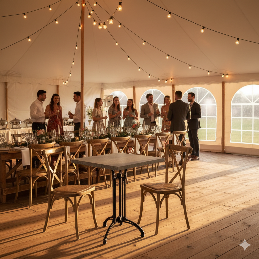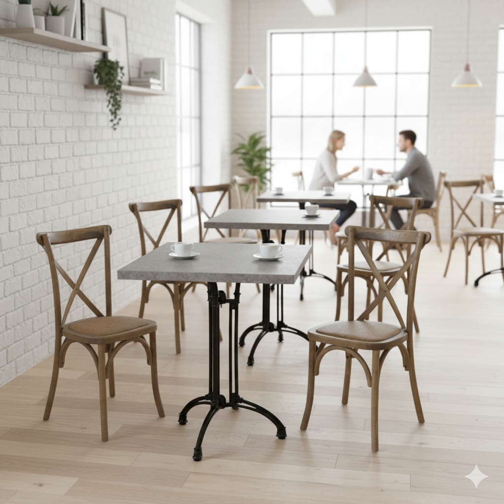 Denne løsningen er skreddersydd for kafeer, restauranter, hoteller og konferanseområder, hvor både estetikk og funksjonalitet står i fokus. Crossback-stolen gir en behagelig sitteopplevelse og et varmt, rustikt uttrykk, mens bordplaten i Exteriolit er svært slitesterk, enkel å rengjøre og motstandsdyktig mot både fukt og varme. Det stabile Nice 3 understellet sikrer en solid base som tåler daglig profesjonell bruk.