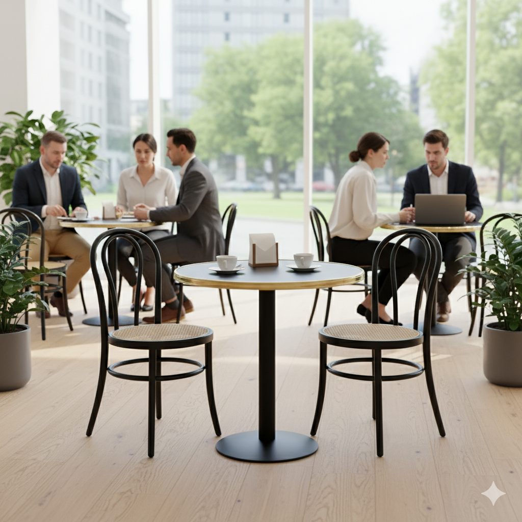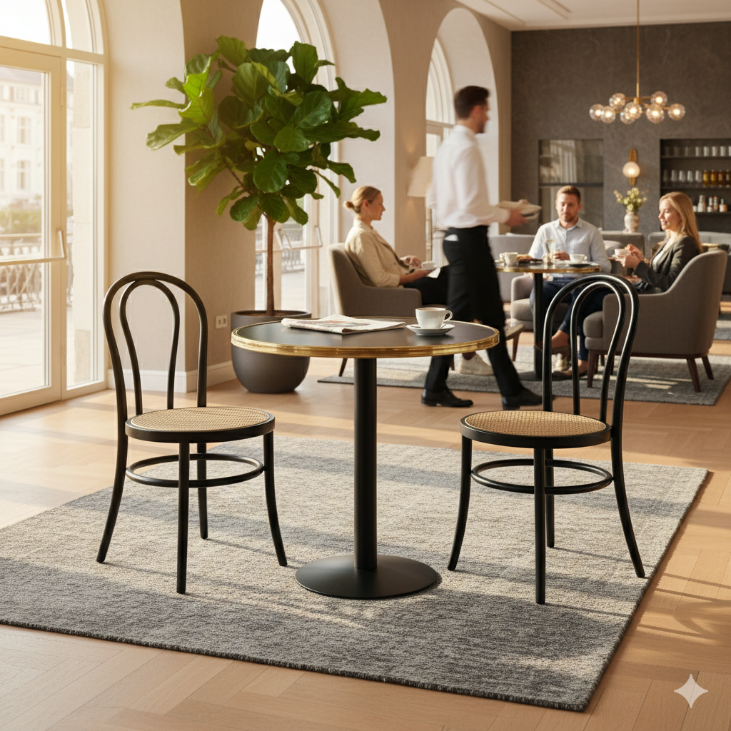 Wienerstolen med flets de kombinerer letthet og komfort med et ikonisk design, som har prydet kaf er i generasjoner. Den svarte fargen gir et moderne tvist, mens flets det bidrar med varme og h y s ttekomfort. Bordplaten i Werzalit er ekstremt slitesterk, lett rengj re og motstandsdyktig mot b de fukt og varme perfekt til travle omgivelser. Den elegante messingkanten tilf rer et eksklusivt uttrykk som l fter innredningen.