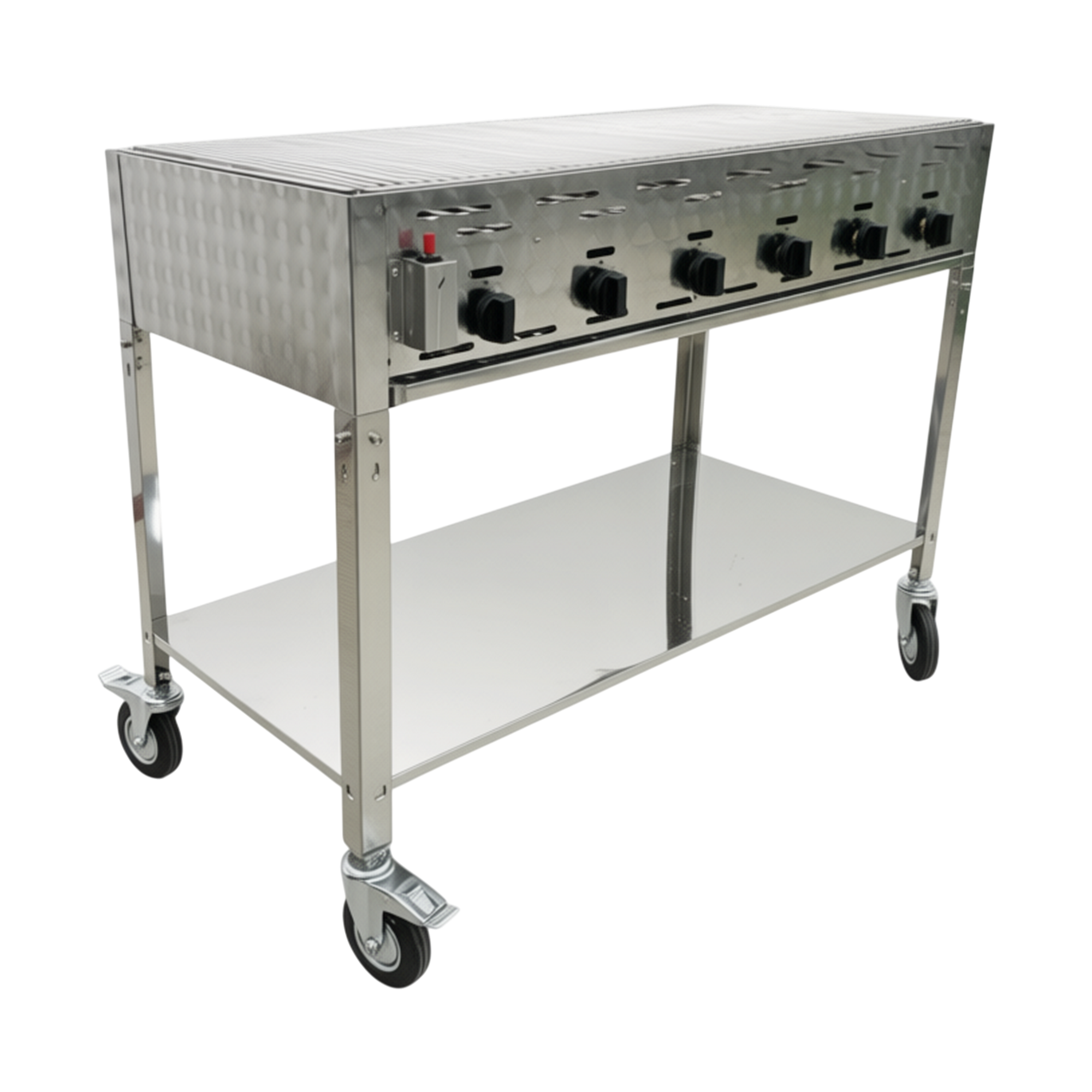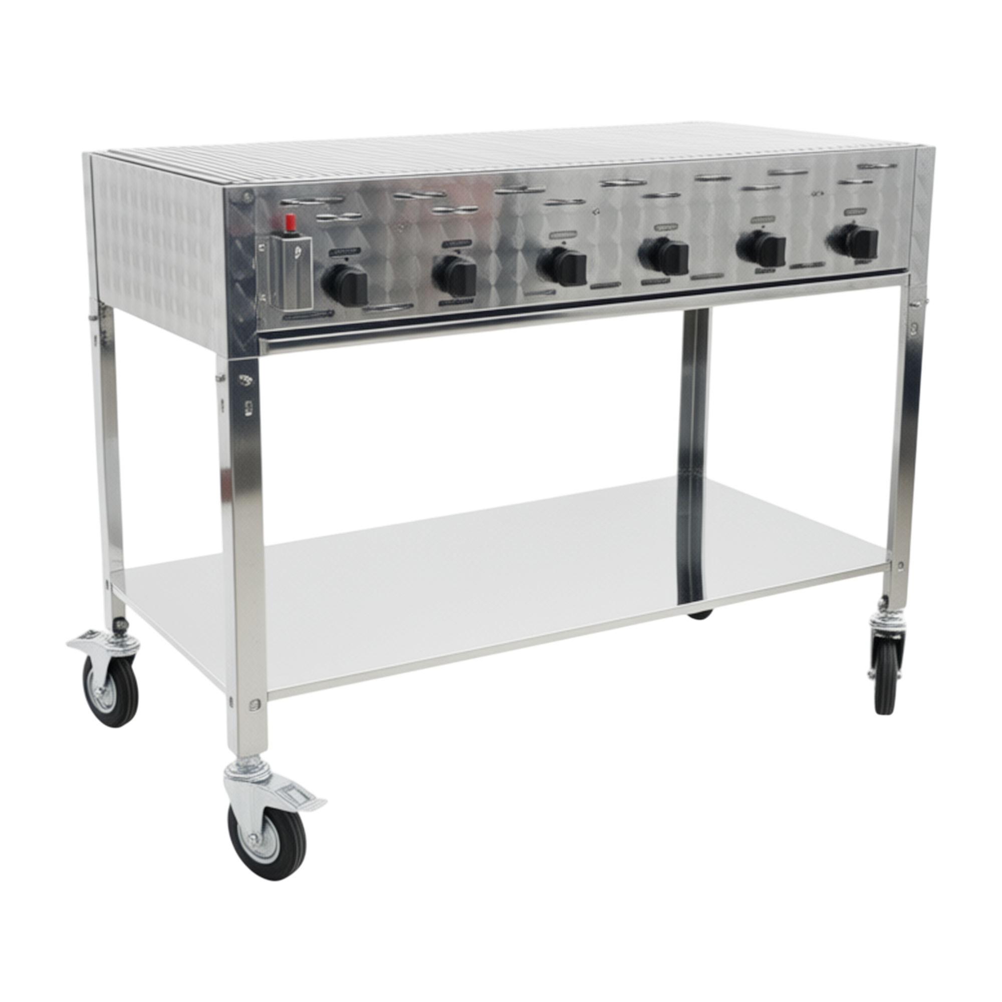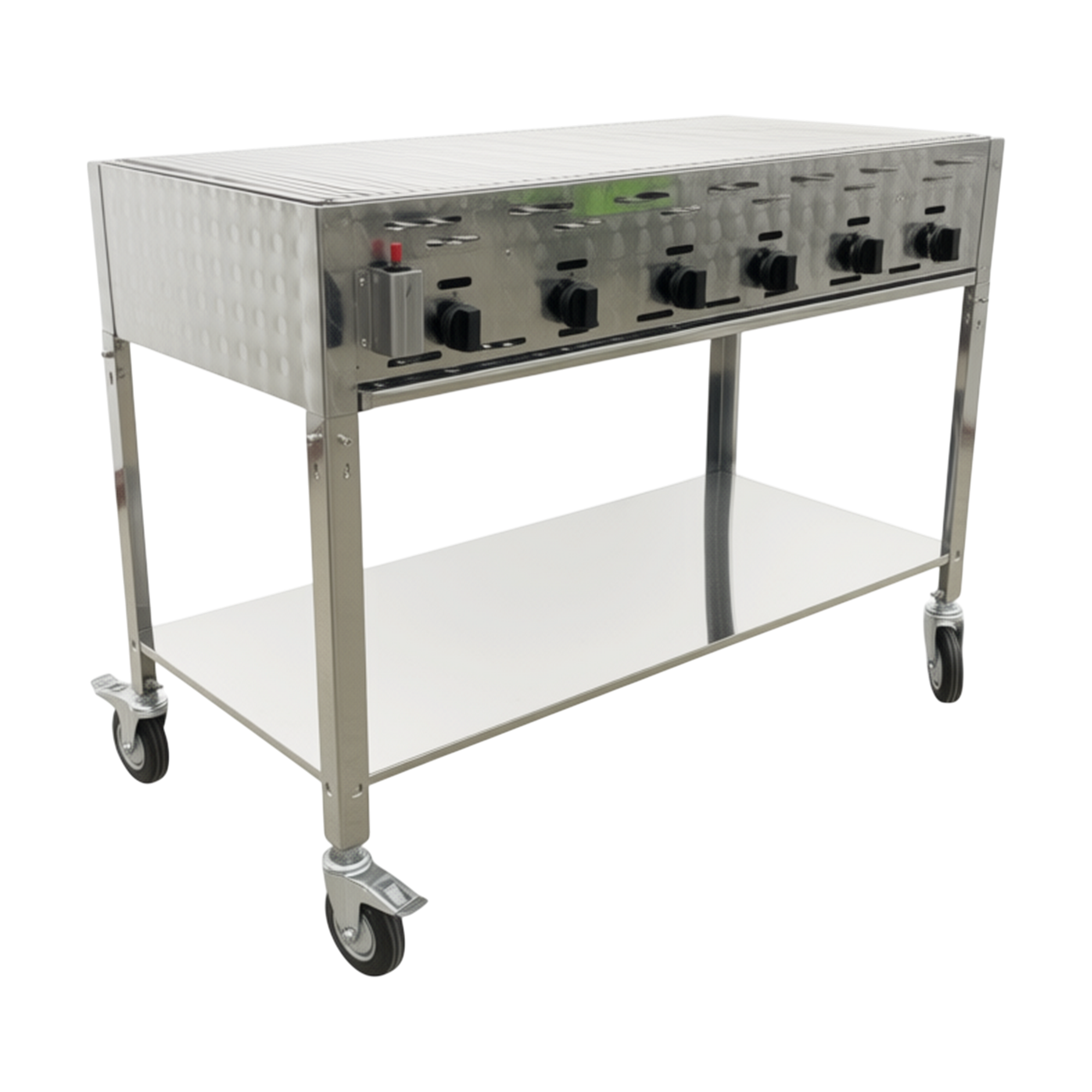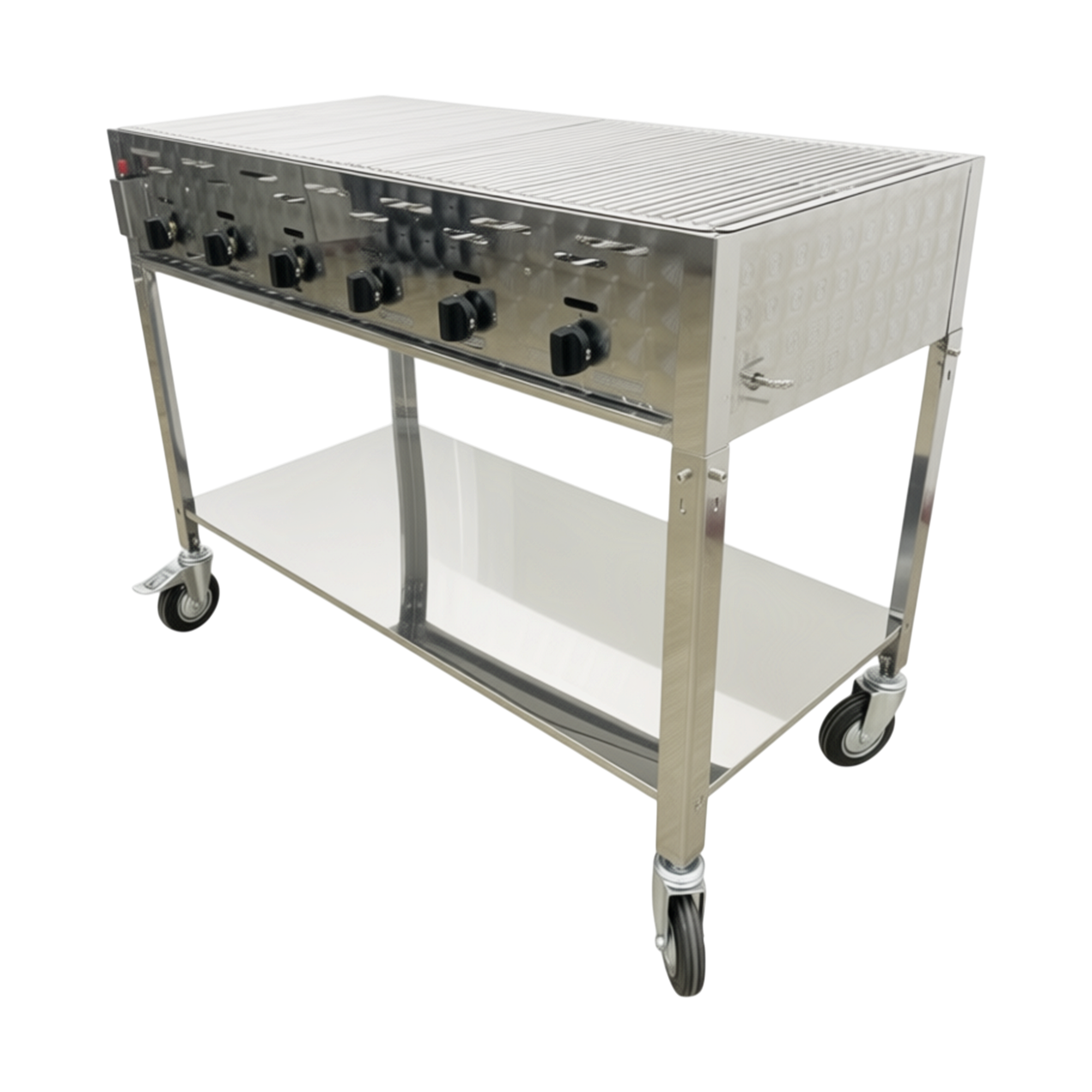 Det komplette stativet med hjul gjør grillen enkel å flytte og plassere fleksibelt i den daglige oppsettet. Den store arbeidshøyden gir ergonomiske arbeidsforhold, mens hyllen under grillen gir praktisk oppbevaringsplass til utstyr. En solid og profesjonell løsning for kjøkken og arrangementer, hvor tempo og kvalitet skal gå hånd i hånd.