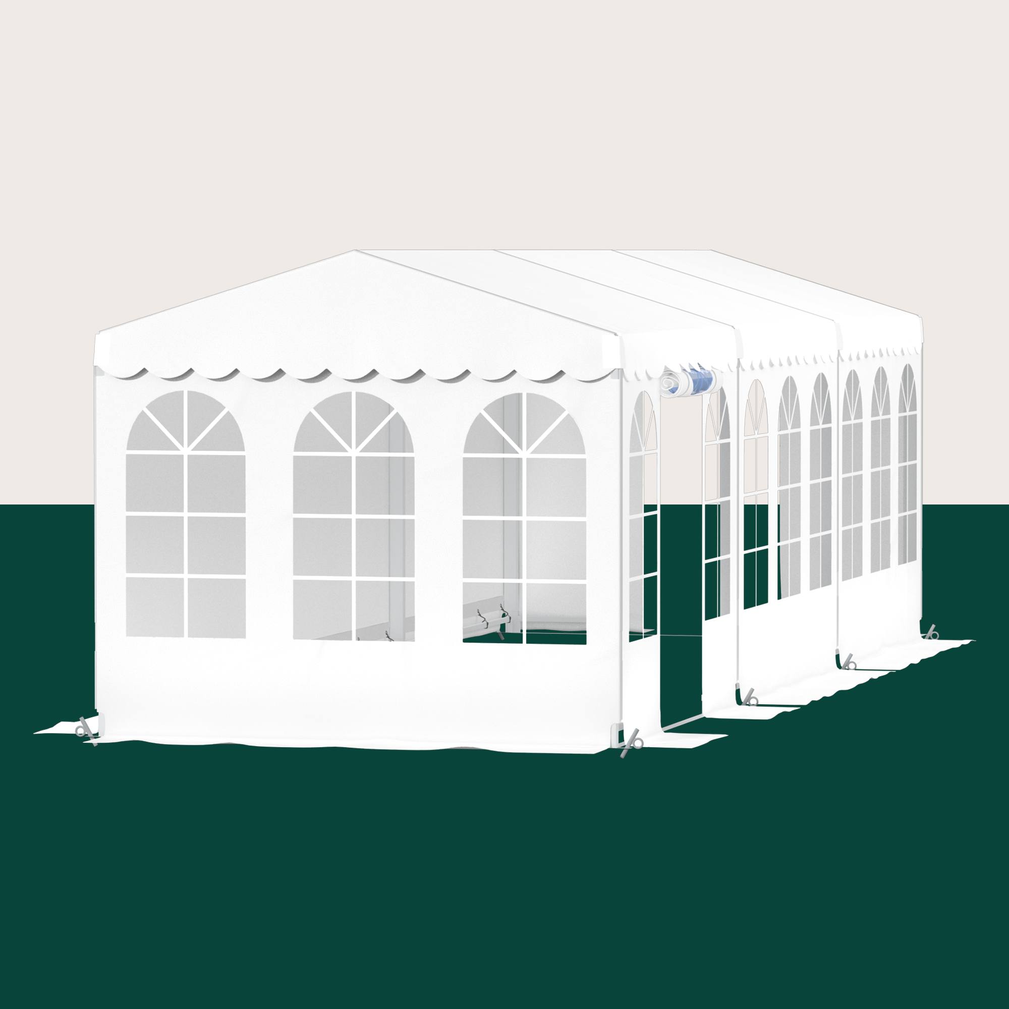 3×9 meter komplett Pro Event Tent leveres med sperrer, fittings, gummistrikker, bolter og splits samt tak- og sideduk. Jordspyd kan kjøpes til avhengig av ønsket vindbelastning.